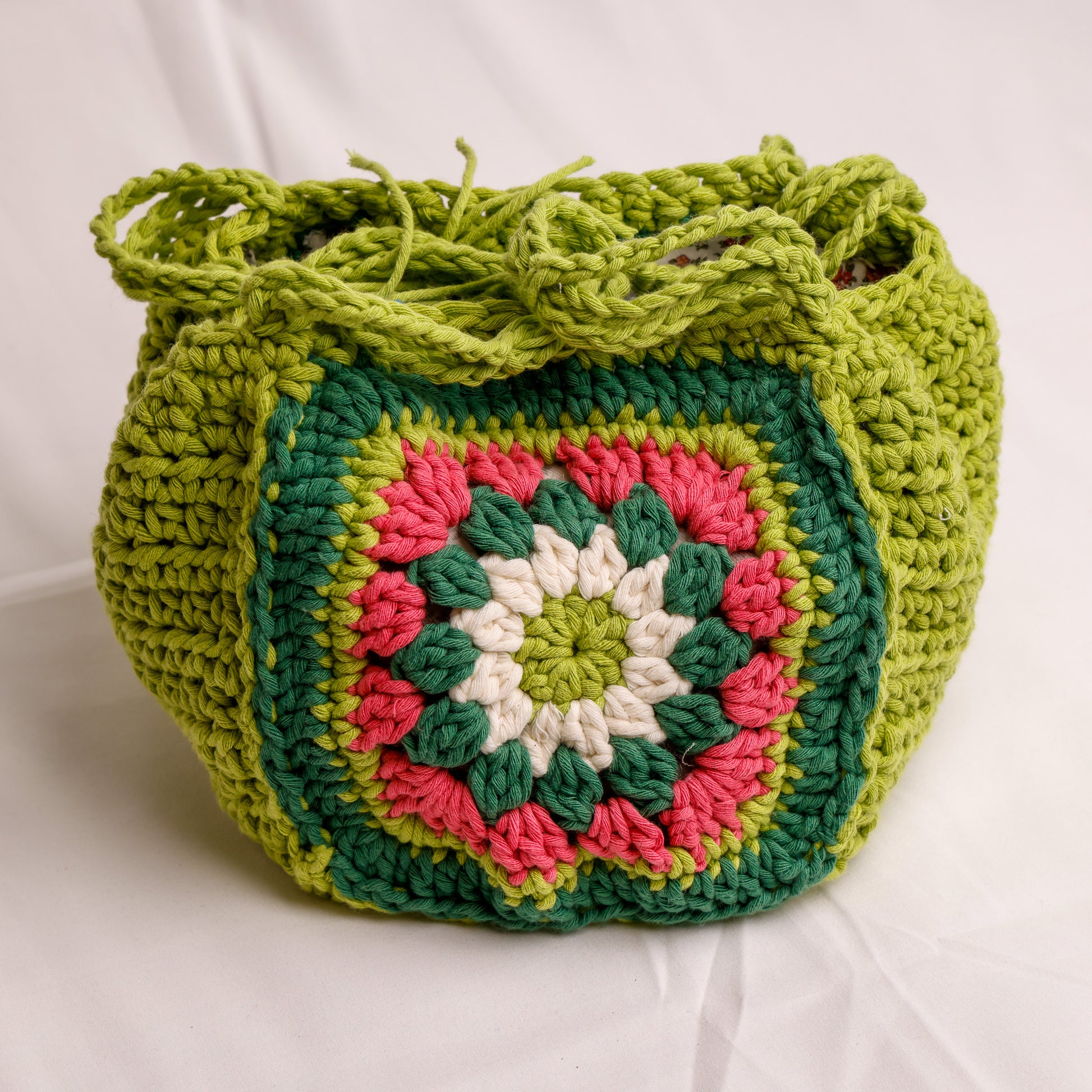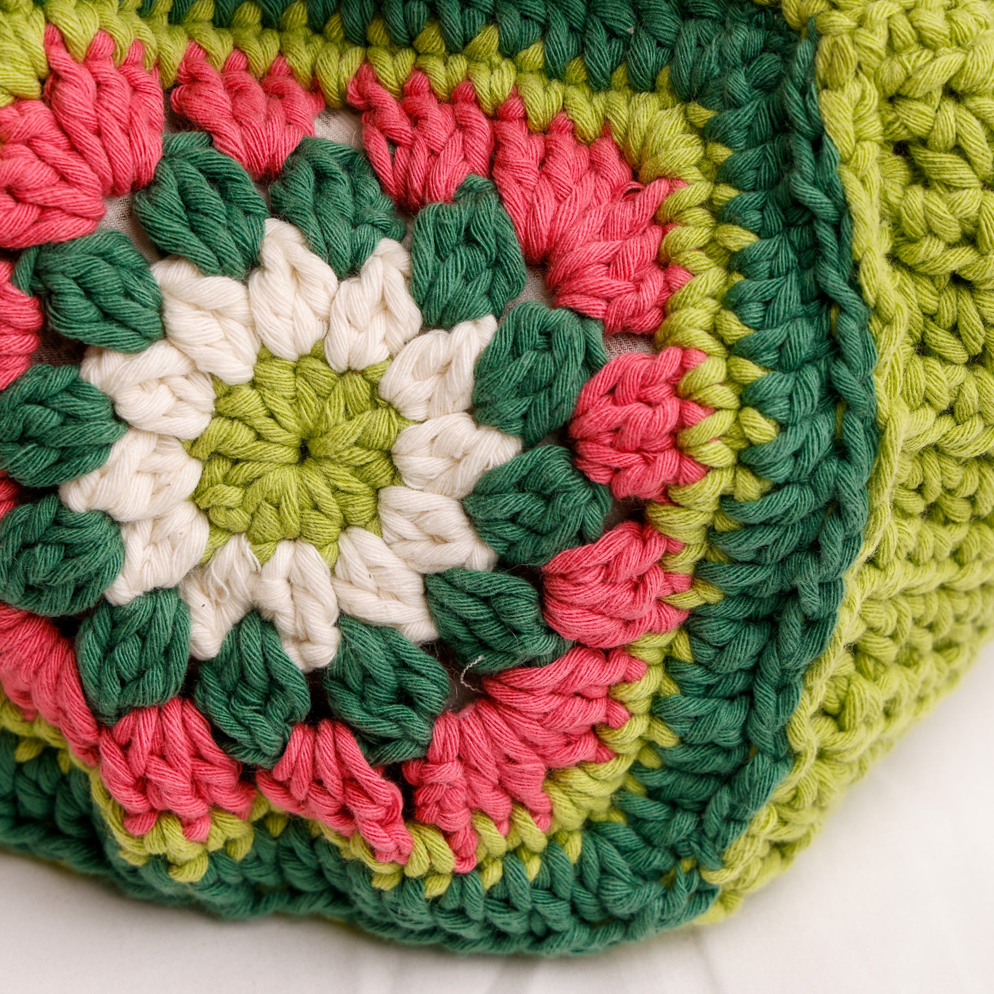 Realizzata in cotone medio foderato, "Prato di Primavera" unisce comfort e resistenza. Il manico corto garantisce una presa comoda e sicura, mentre la lavorazione all’uncinetto aggiunge un tocco di eleganza artigianale. Perfetta per chi cerca uno stile fresco e raffinato in ogni occasione.