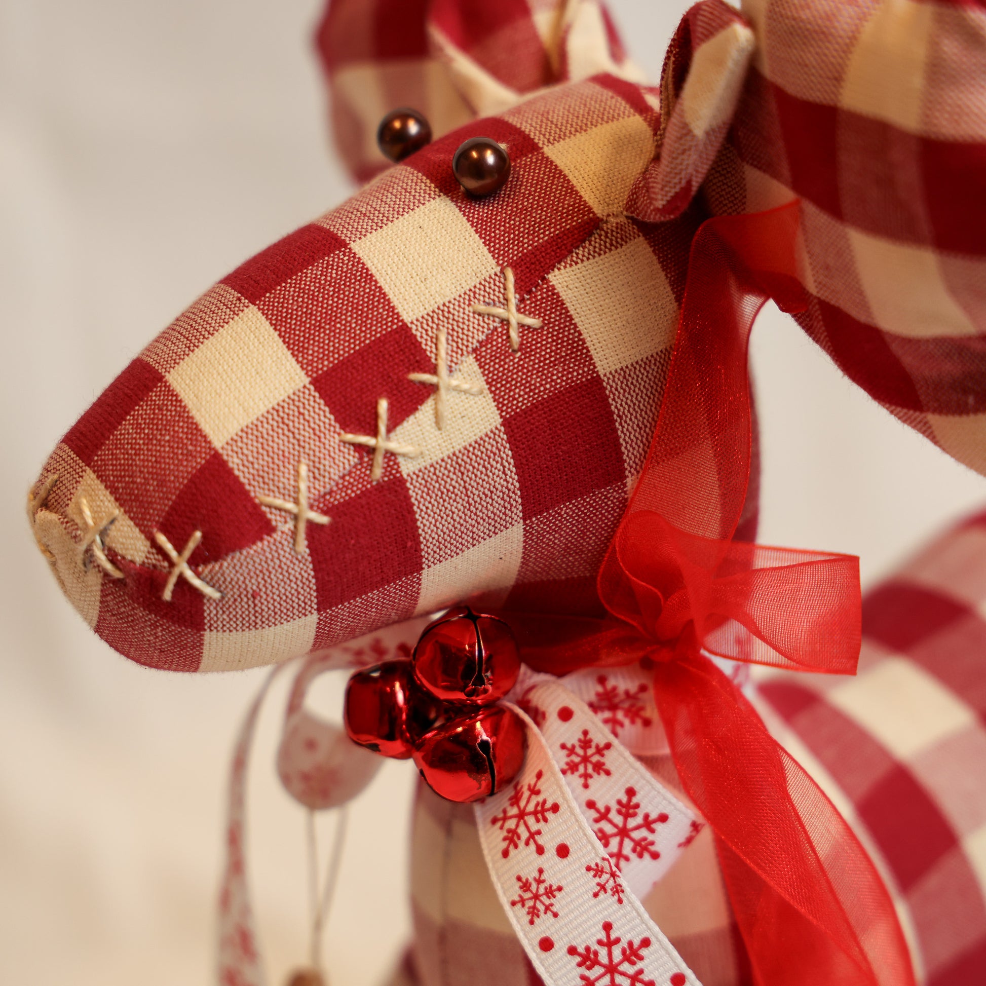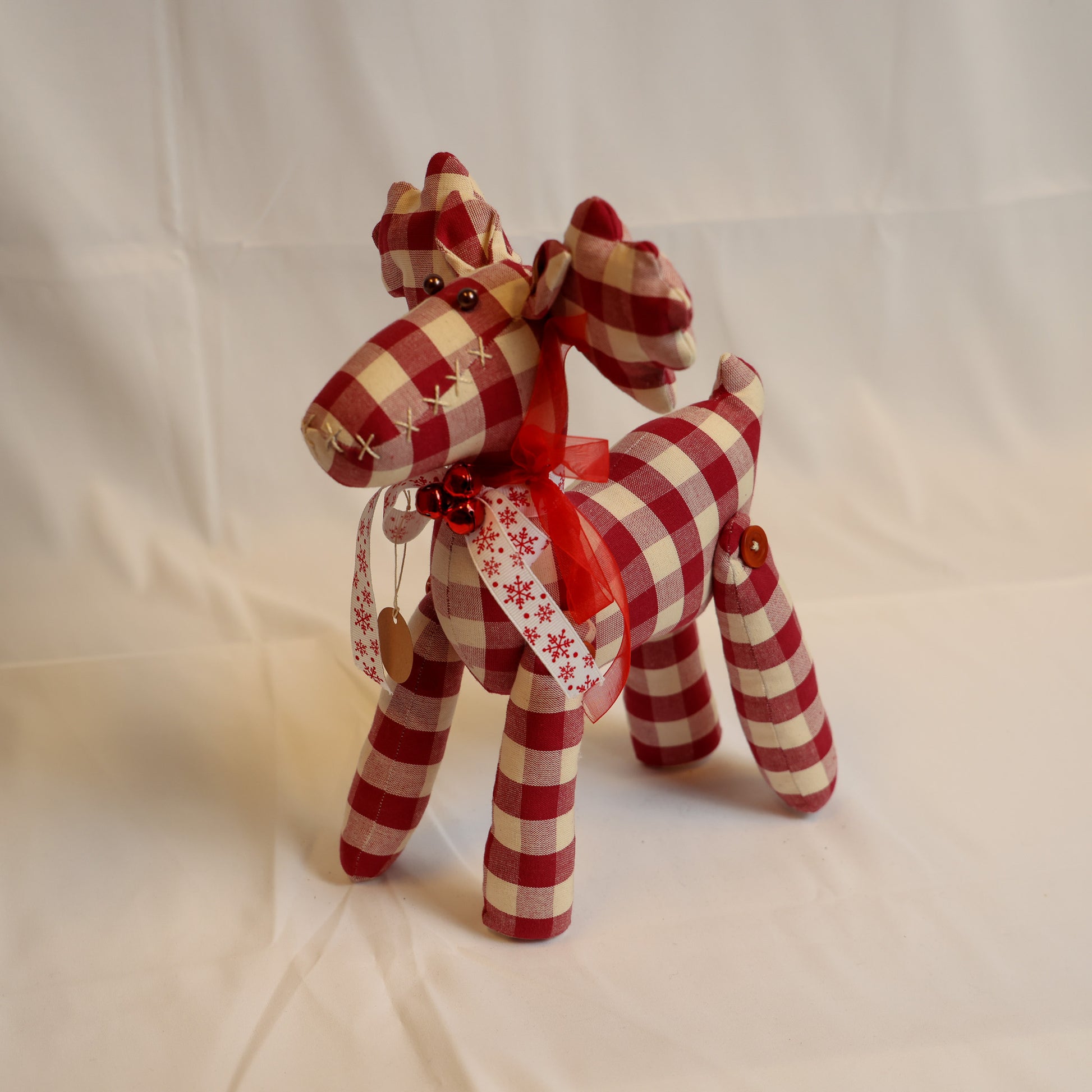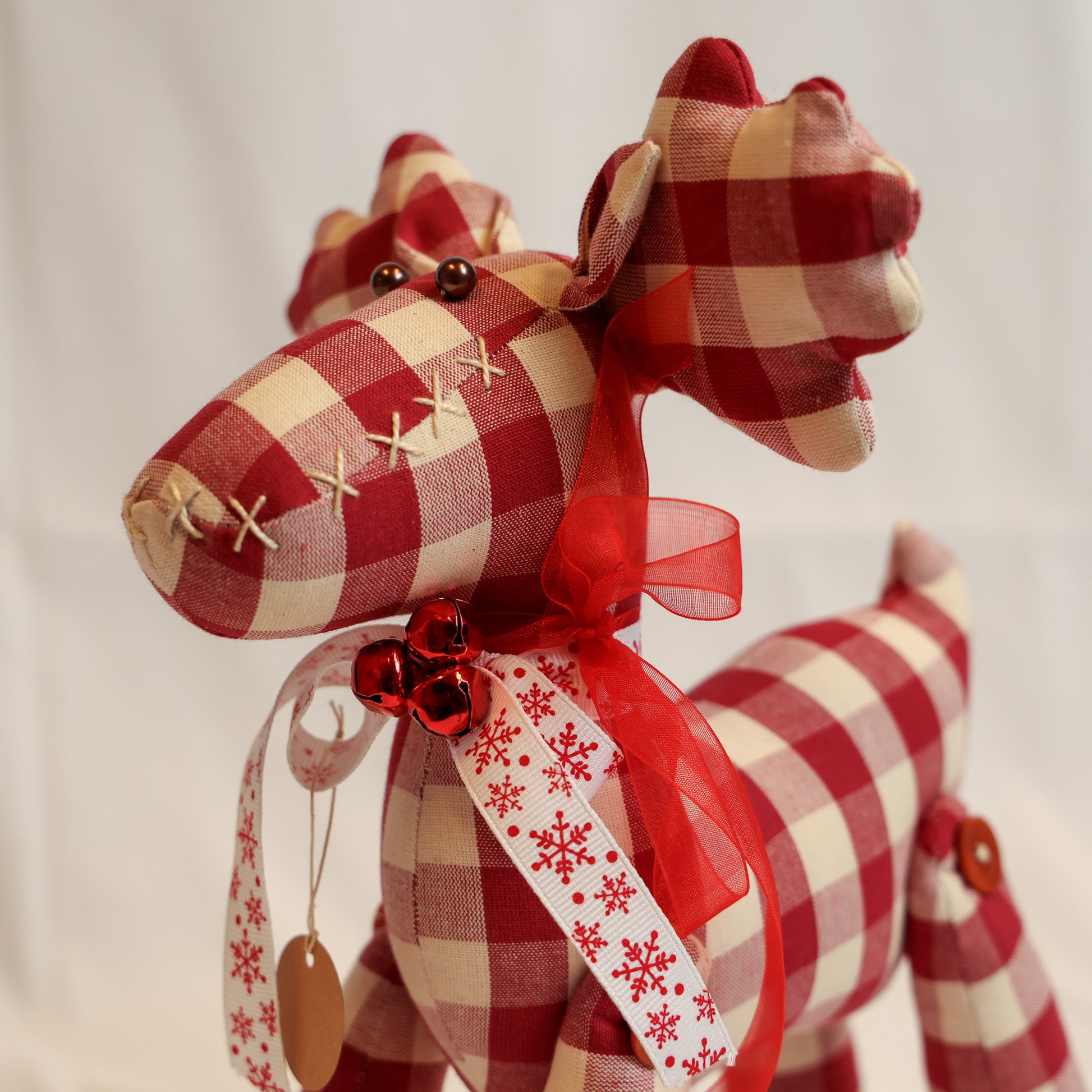 Renna in tessuto a quadretti bianchi e rossi, interamente cucita a mano che potete utilizzare come centrotavola.